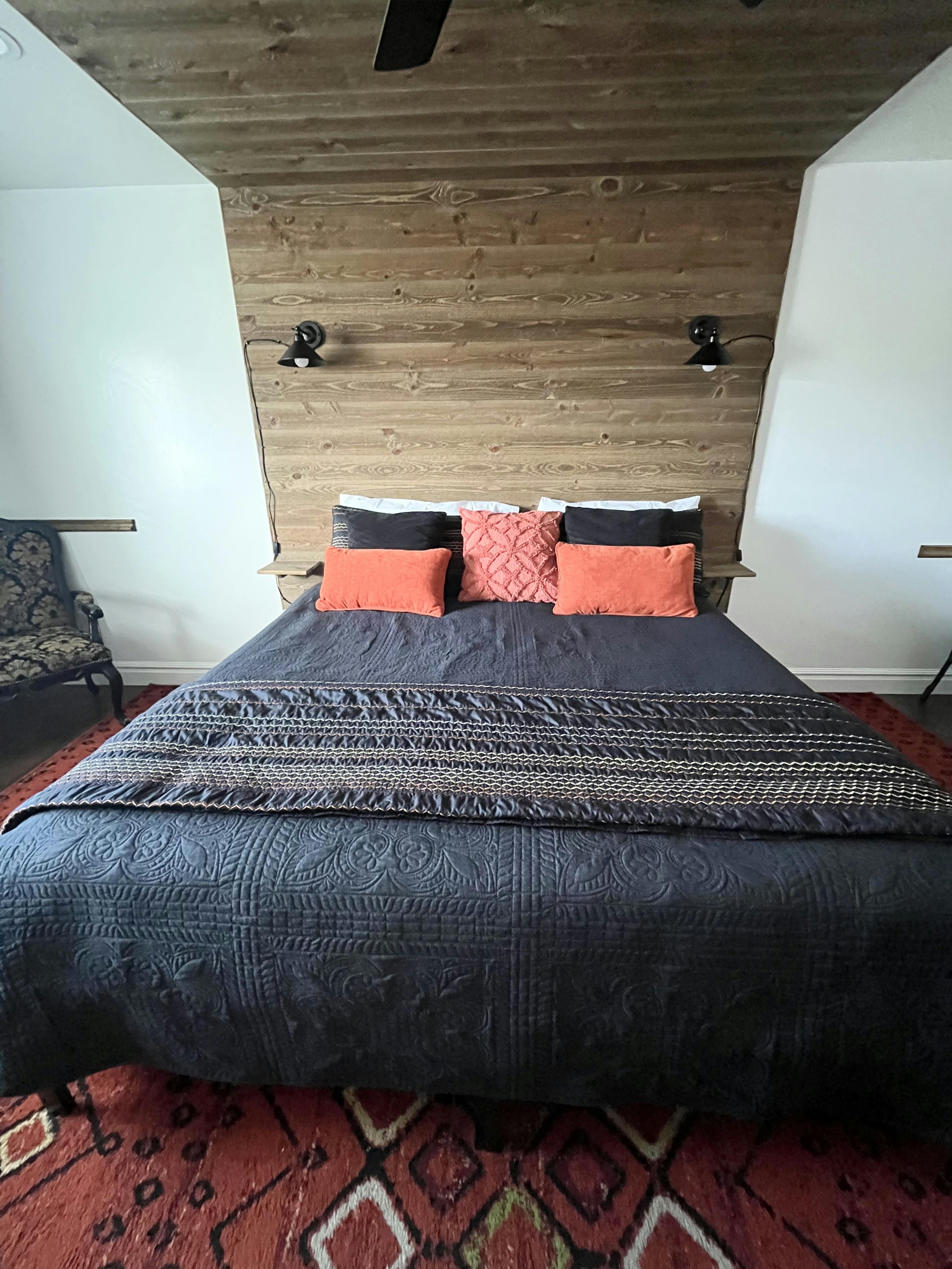 This brand new king room is located outside of the old house in our courtyard area. Warmly decorated with some antique pieces, we hope you will feel at home in this room. A king size bed with a headboard made from an original door out of the old house, is the centerpiece. It has a private ground level entrance with it's own heating and air conditioning. This room features a private three piece bath with a tub and shower combo. It is also equipped with a fridge, microwave, and coffee maker. We hope you love this room as much as we do.